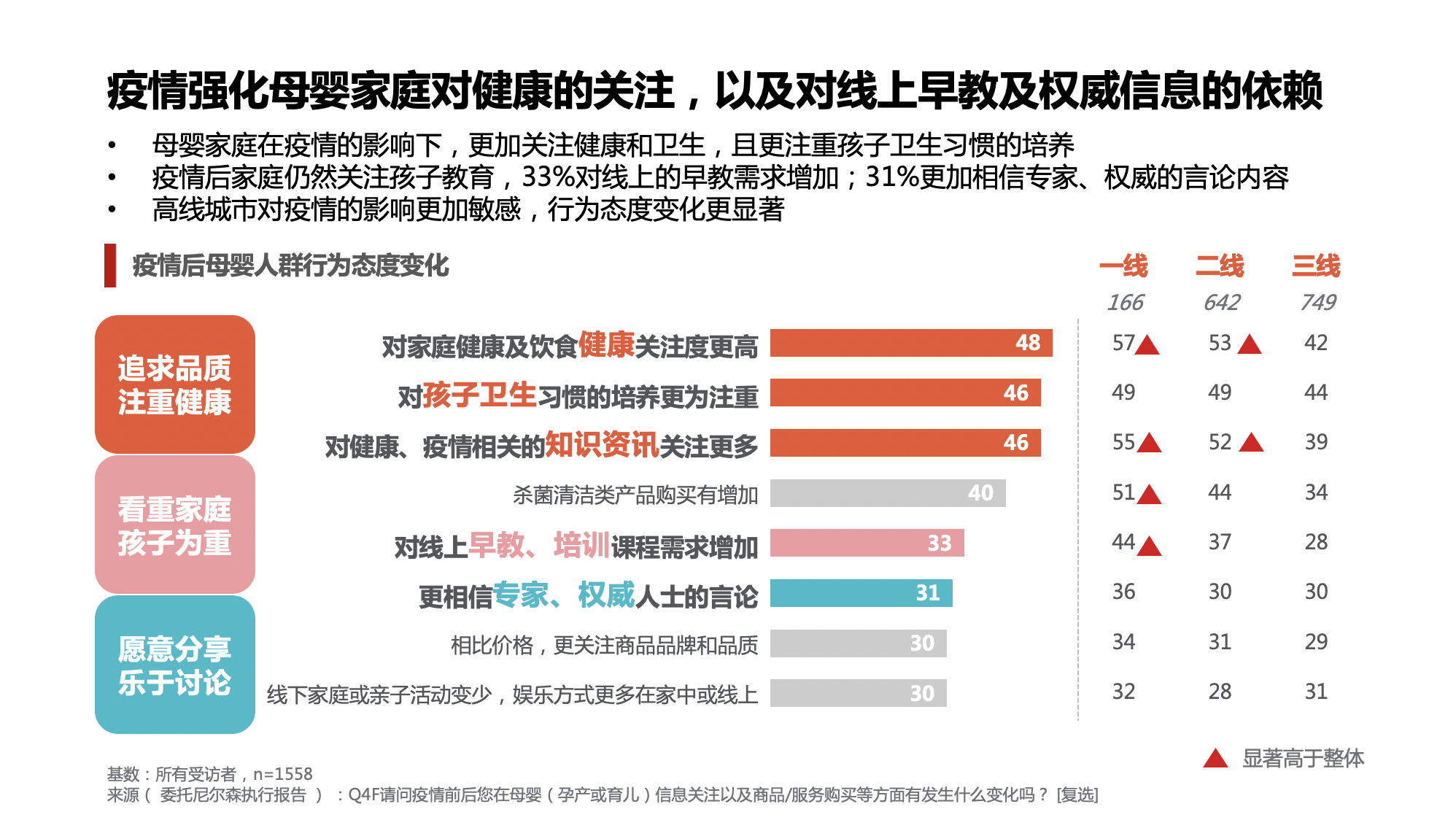 值得一提的是在疫情的影响下,母婴家庭对健康与线上早教关注度被强化。尤其在讯息接收更高效、公共管理更发达的高线城市,母婴家庭对疫情更加敏感,消费行为及生活态度变化更明显。