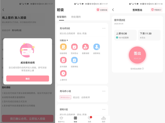 (在摩尔妈妈APP中,到家老师可完成签约合同、班级管理、签到签出等)