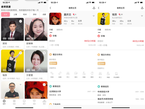 摩尔妈妈APP上的“到家老师”列表和个人主页