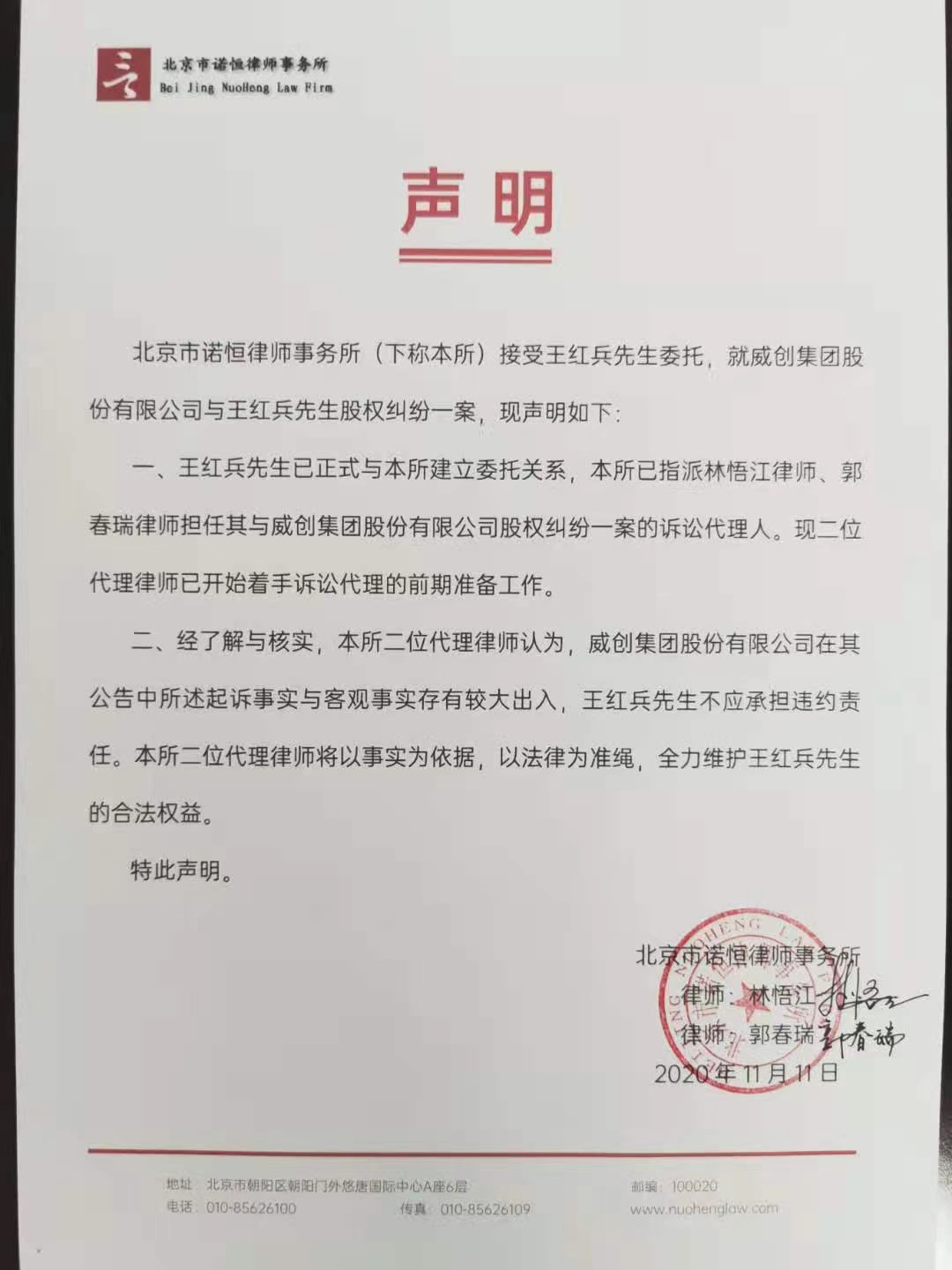 多知网11月14日消息,继威创发布公告,起诉王红兵之后,王红兵委托北京诺恒律师事务所发布《声明》。《声明》指出,威创在公告中所述起诉事实与客观事实有较大出入,王红兵不应承担违约责任,目前两位代理律师已开始着手诉讼代理的前期准备工作。