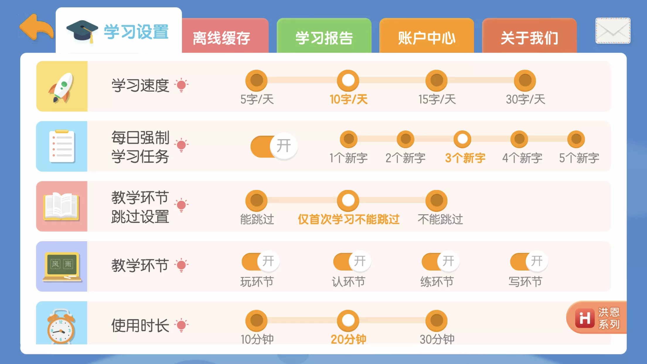 另外,为避免孩子长时间在线学习,《洪恩识字》App根据孩子和家长的需求,设置了人性化的功能选择,家长可以根据孩子的年龄和情况选择每日学习10分钟、20分钟或30分钟。