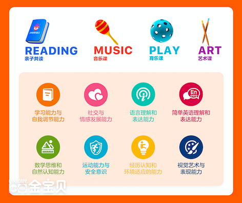此次课程发布,金宝贝将早教课程划分为六大学阶,并按照孩子的阶段性发展特点为其匹配相应的课程。其中包括育乐课、音乐课、艺术课以及亲子共读课四大模块,覆盖八大能力领域。