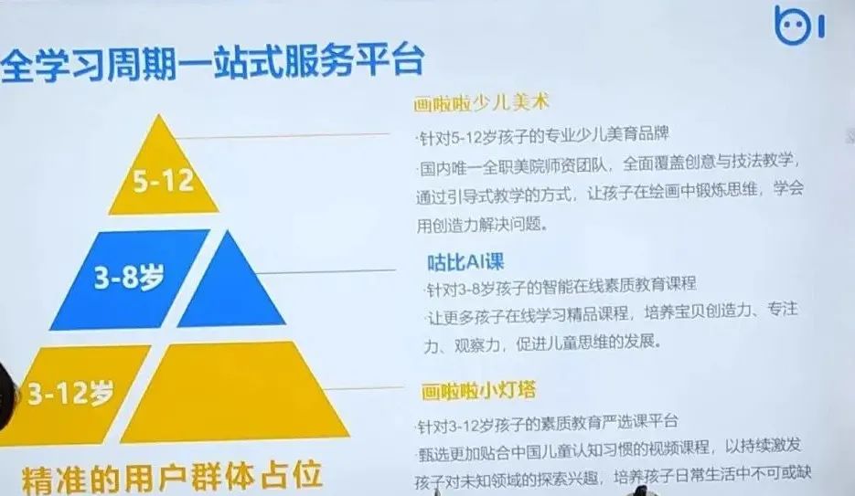 在年龄层上,咕比AI课面向3-8岁孩子,在K2-K3阶段的孩子可以跟画啦啦小班课的用户群(5-12岁)无缝衔接,起到流量承接作用。