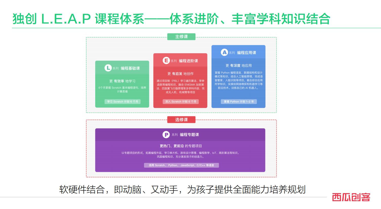 西瓜创客使用的是独创的L.E.A.P课程体系。其中,L系列为编程基础课,6个月掌握图形化编程基本语句;E系列为编程进阶课,6个月通过项目制(PBL)的方式进行图形化编程在项目中的实际运用,促进知识内化;A系列为编程应用课,1-2年掌握Python编程语言,接轨人工智能;而P系列为专题课,用软硬件编程结合的方式拓展编程外延,动脑与动手相结合。