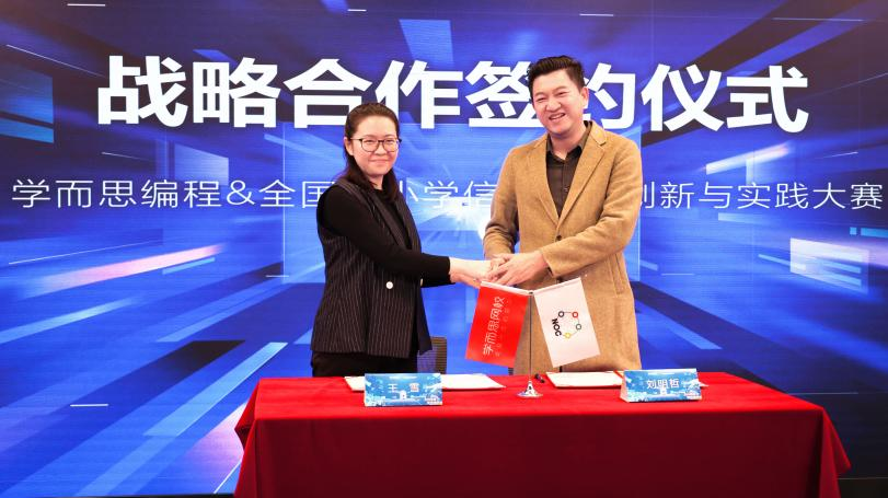 NOC大赛组委会常务副秘书长刘明哲(右)、学而思编程负责人王雪(左)签约
