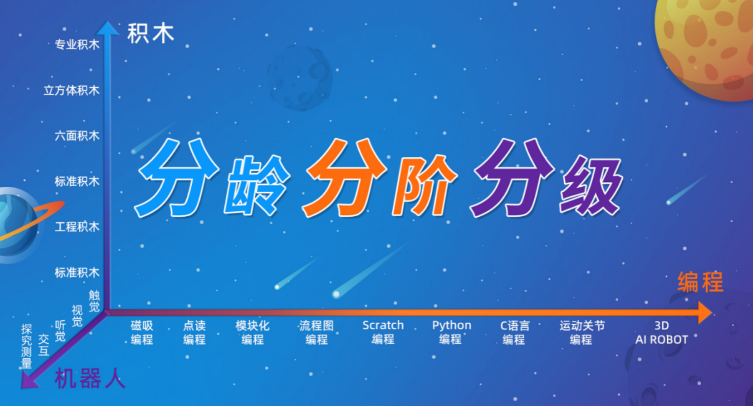 鲸鱼机器人的产品是有课程体系的,它分层分得非常细致,分龄分阶分级,每一个年龄段都有对应的产品。以编程为例,从实物编程到模块化编程,再到语言类的编程,其难度是阶梯化的,有很强的连贯性。