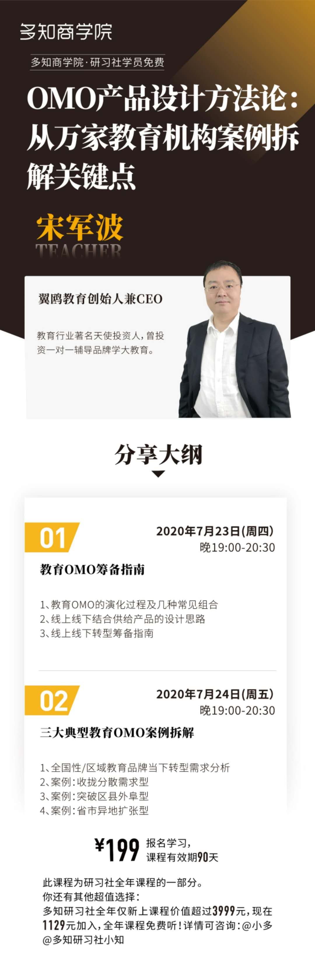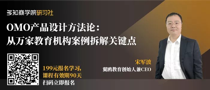 因此,多知研习社邀请翼鸥教育创始人兼CEO宋军波作为导师,研发了这套专题课「OMO产品设计方法论:从万家教育机构案例拆解关键点」。