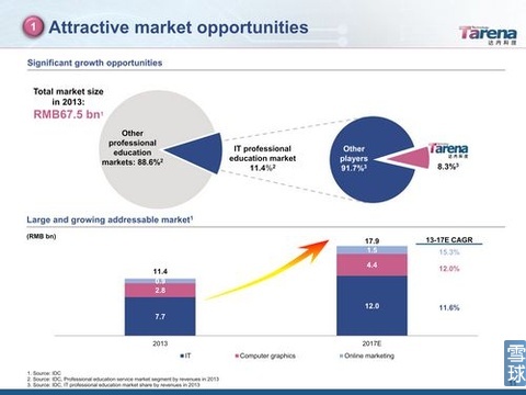 除了IT培训,目前达内还涉及的计算机图形、网络营销,IDC的数据显示2013年分别是28亿人民币和9亿人民币的市场规模,IDC预计到2017年,IT培训、计算机图形培训、网络营销培训的市场规模分别是120亿、44亿、15亿人民币;