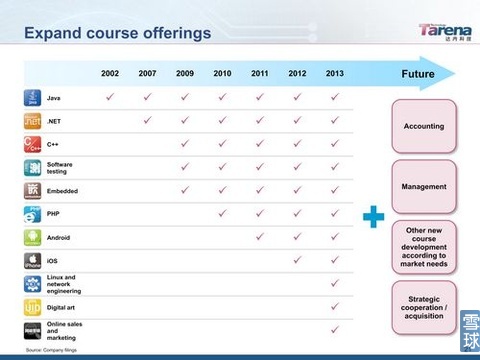 属于产品扩张,2002年创建时只开设了Java培训这一个课程,2007年才开始增加了.net,2009年由增加了C++、软件测试、嵌入式三个课程,2010年到2012年每年新增一个培训课程,2013年新增三个培训课程,未来有可能会扩展到会计、管理以及其他有市场需求的培训,另外有可能进行战略收购来增加培训课程