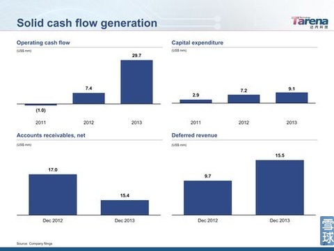 运营现金流从2011年的-100万美元大幅提升至2013年的2970万美元,资本开支2013年910万美元,应收账款由2012年的1700万美元降低至2013年的1540万美元,递延收入由2012年的970万美元大幅提升至1550万美元。
