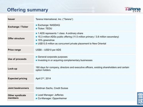 $达内科技(TEDU)$ 宣布IPO发行价区间为8-10美元,计划发行1530万份ADS,公司发行1150万股,献售股东出售380万股,按区间上端算,将融资1.15亿,估值约5亿美元。预计达内教育将于4月2日公布最终IPO发行价,之后正式IPO,应该是2014年中概赴美IPO第一股,同时也将成为中国职业培训行业的第一家上市公司。