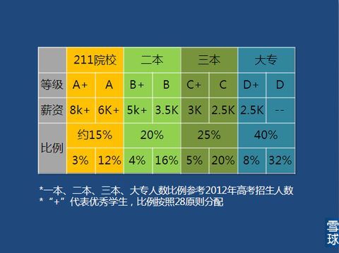 每一个学校每一个班都有好学生和平庸者,毕业后的收入也会有所差异。我们按照28原则来把好学生和平庸者做一个区分。然后很势力眼的将就业薪资作为唯一标准,来把人才分级,就会得出以下的表格。(薪资部分是预估均值,数据基本合理,单体有波动。)