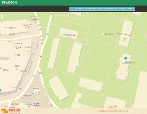 Foursquare提供了部分数据,由学生和老师分享而来。Foursquare是2009年推出的一款地理定位APP,用户可以在上面分享或查找比较有意思的地方。培生的这款App就采用了它的技术。