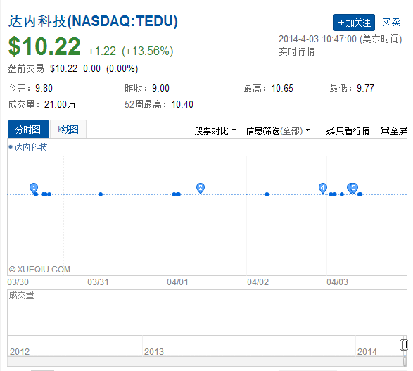 值得一提的是,达内不仅是今年第一支赴美上市的教育股,也是第一支上市的中国概念股。随着美股大门的打开,新一波的教育投资热潮将来的更加凶猛。(多知网 陈雯)