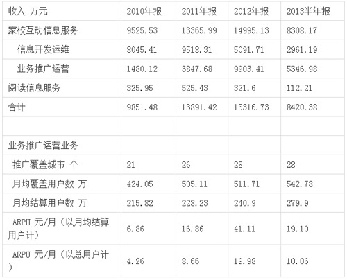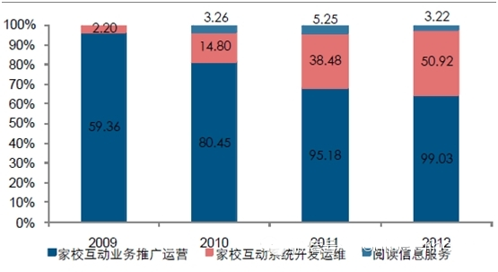 2010-2012年,公司依靠较强的技术研发实力、业务推广能力及较大的用户规模,在与各地业务合作中获得了较好的合作条件,除公司与中国移动中山分公司协商并参考广东地区平均结算比例的基础上将中山亲情电话业务的结算比例由95%调整至70%外,其他各地各子业务结算比例基本保持稳定。服务运营商与基础运营商的收入分别占行业规模的54%和46%,2009-2011年家校互通信息服务行业的市场规模为9.4亿、14.7亿和19.5亿,这个收入已经扣除基础运营商(即三大运营商)的分成收入。公司在行业中的份额分别为6.5%、6.6%和7.3%。从这方面看,公司主要体现的是SP的属性。