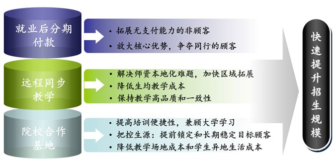 大学扩招,除让大学生倍感就业压力将职业培训当成就业前的必备功课外,也让大学将解决就业问题作为重要工作之一。远程同步教学模式,将就业培训延伸到了校园,不但可以帮大学提升就业率,而且学生的安全问题和大学教学计划都得以兼顾。“就业后分期付款”降低了经济压力,消除了风险。