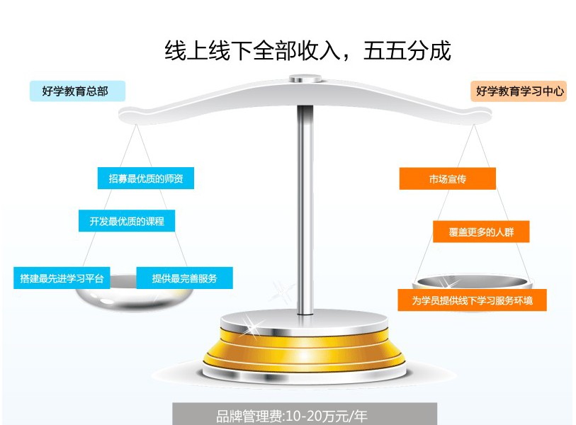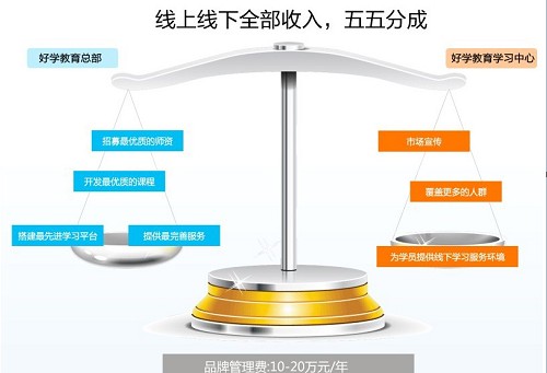那么加盟商怎么赚钱呢?肖松柏说,靠分成。“如果该地区有学生购买课程或学习卡,无论是在网点买还是在好学教育上买,我们都和加盟商五五分成。另外,加盟商还可以利用实体店来销售更多的实体和网络产品。”