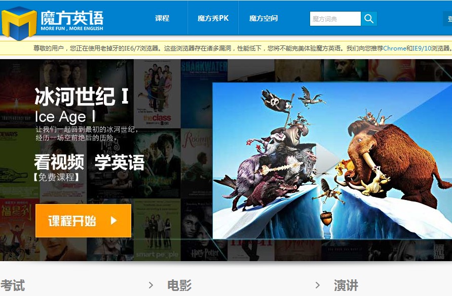魔方英语上线于2010年10月,口号是“看电影,学英语”。在这里,学习者可以在美剧、电影资源中学习单词和最原汁原味的口语。具体的学习过程分为看视频、练习和测试、看讲解、口语练习四个环节,魔方英语为每个环节都做了结构化处理,并申请了专利。