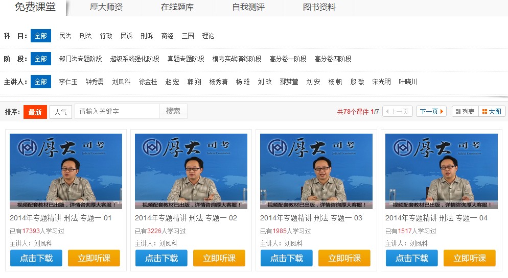 多知网登陆厚大官网,发现目前厚大有几个主要模块:免费课堂(网课、题库等)、厚大知道(问答服务)、教服中心(招商)和厚大面授(面授课程信息)。其中免费课堂是主打产品,目前有78节视频课程,每节60至90分钟,清晰度很高,运行也比较流畅。科目上包括民法、刑法、行政、诉讼等,授课教师有李仁玉、刘凤科等十五位,学生可以按自己所处的学习阶段来选择课程。