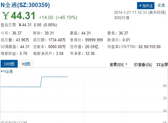 一小时之后,全通股价又在继续交易的一分钟内上涨到44.31元,较开盘价上涨21.83%,依据深交所关于上市首日临时停牌的规定,将临时停牌至14:57。