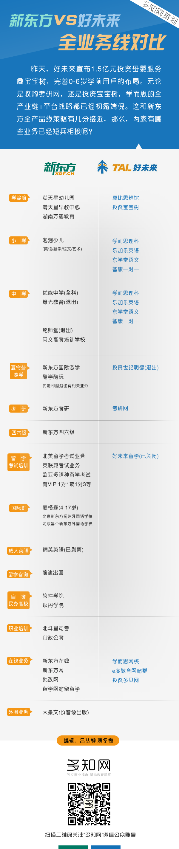 昨天,好未来宣布1.5亿元投资母婴服务商宝宝树,完善0-6岁学前用户的布局。无论是收购考研网,还是投资宝宝树,学而思的全产业链+平台战略都已经初露端倪。这和新东方全产品线策略有几分接近,那么,两家有哪些业务已经短兵相接呢?