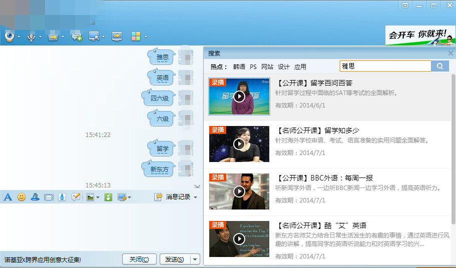 多知网5月7日消息,最近腾讯在教育方面又有新动作,且终于祭出了核心武器——QQ客户端。用户在对话框中输入雅思、新东方等教育机构或专有名词,点击文字超链可在右边框直接得到视频课程结果,这极大的缩短了用户寻找课程的路径。