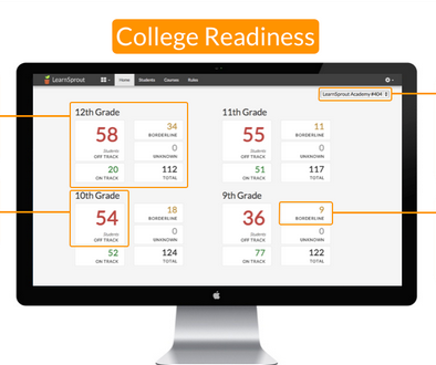 LearnSprout最新公布的“大学升学准备仪表盘”功能,服务于高中辅导员,让他们能以简便、直观的工具监控学生的大学升学准备情况。分析学生升学准备情况的数据当然来源于学生信息系统,这项功能要分析的数据有GPA(平均成绩点数)、出勤记录,考试成绩等。