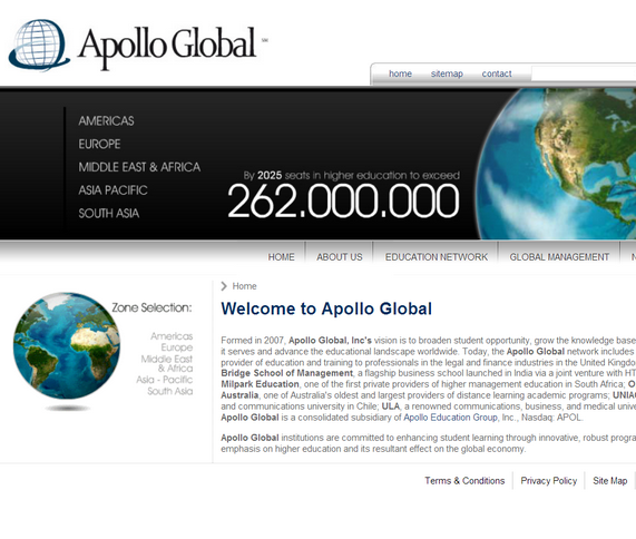 阿波罗教育集团是一家美国的营利性高等教育机构,也是全球最大的教育上市公司,有凤凰城大学、亚维雅学院、西方国际大学等若干牟利教育机构。