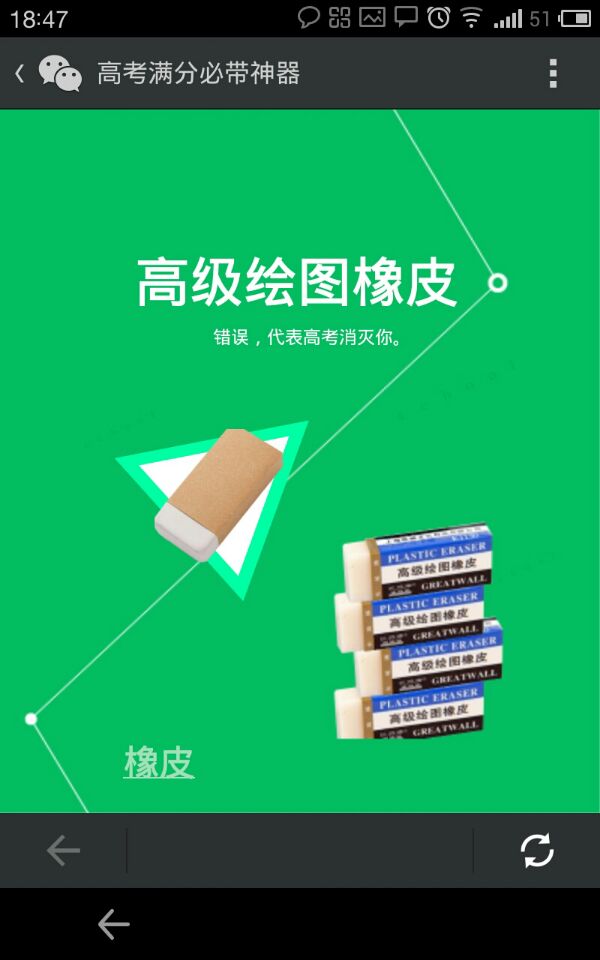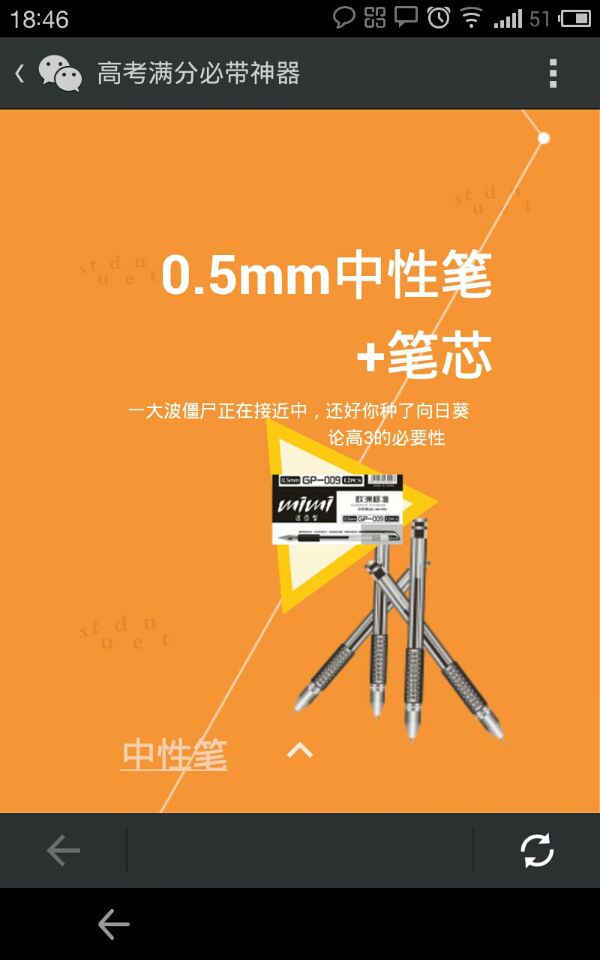 精装海报配上文案是以往常见的宣传做法,不过在现在这个考生们都焦头烂额的时候,他们还有心情静下心来看大段的心灵鸡汤文字吗?就主题来看,“高考满分必带神器”flash做的是和普通海报宣传一样的工作,只是在语言风格上和表现形式上进行了包装,对每个工具进行有意思的描述,比如“中性笔—一大波僵尸正在接近中,还好你种了向日葵”“橡皮擦—错误,代表高考消灭你”。有趣的画面和简单的文字内容,很容易成为微信朋友圈的转发对象。