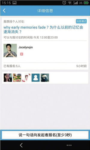 据英语说官网介绍,“英语说”是女娲网络公司旗下的产品,定位语音聊天练英语,希望建立一个在线“英语角”的社区,鼓励大家要把英语说出口。除了匹配话题,还可以边学习边交好友。英语说成立于2014年1月,目前只推出了Android版,iOS版尚未上线。