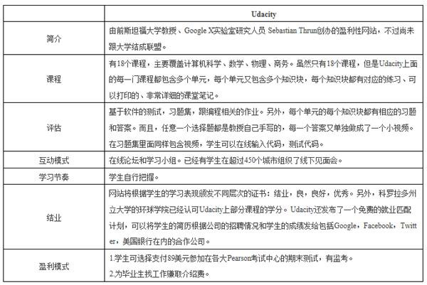 Udacity是由Se-bastianThrun、DavidStavens和MikeSokolsky创建的营利组织,该组织也吸引了商业公司约2100万美元的投资。目前,Udacity共有涉及四个学科的20多门网络课程。这些课程将包含衡量课程掌握程度的积分系统等。