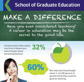 2013年12月,市场调查机构哈里斯互动(Harris Interactive)代表卡普兰大学研究生教育学院做的调查表明,32%的美国人曾经考虑过从事教学工作。根据美国劳工统计局(Bureau of Labor Statistics)的数据表明,到2022年,美国预计会涌现出超过100万个中小学及大专教育方面的新职位,而且这些职位都是在市场已有基础之上增加出来的。此外,这些数据还表明美国将会新增大约9.08万个课堂之外的教育相关职位,包括行政管理和咨询职位,等等。