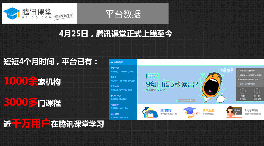 2. 产品发展非常迅速,上线4个月以来,已有1000余家机构入驻,上线3000多门课程,近千万用户在腾讯课堂学习,在线教育服务已初具雏形。
