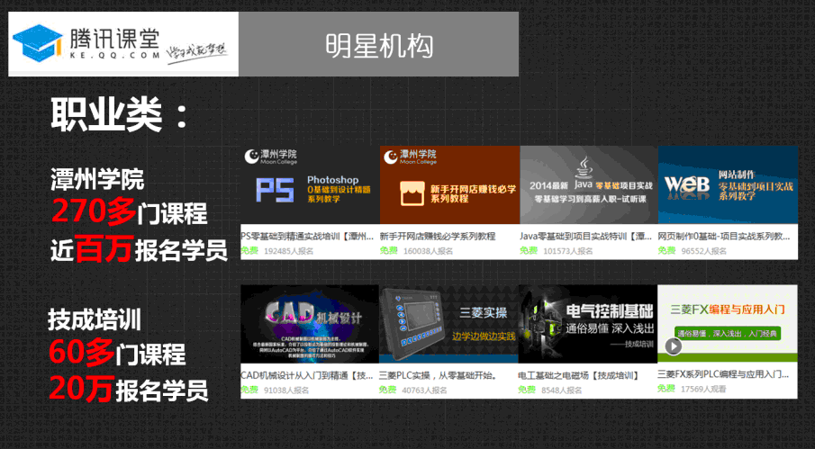 我们这里的明星机构更多是技能类,比如像潭州学院开了200多门课,有学PS、学外部开发等等。可能他面对的对象是现在希望换工作,希望自己有一些技能,希望学一些能够对工作有帮助的课程。所以这类课程在腾讯课程体系里面目前还是比较受欢迎。