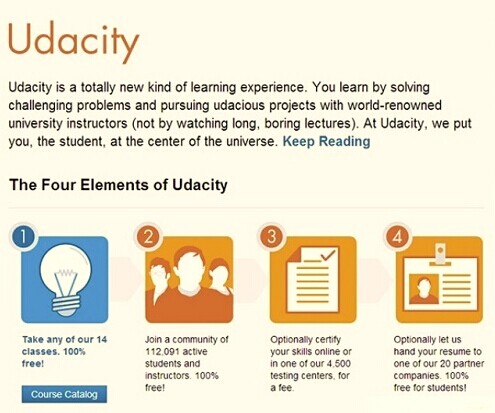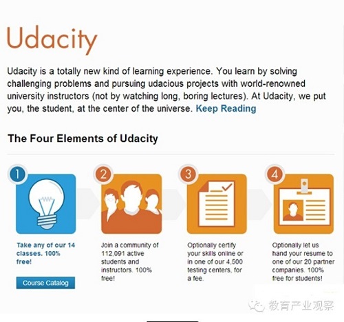 据了解,作为一个营利性平台,Udacity并未实现盈利,与另外两大MOOC巨头一样,此前Udacity上的所有课程均免费,如果想要获得证书认证则需要收费。不过,Udacity在2013年经历了一次转型,免费课堂的模式将不再运营,开始出售在线培训课程,同时将重心转移到IT科技领域的在线培训上。不同于edX和Coursera在加速进军中国市场,目前Udacity尚未与中国高校进行合作。