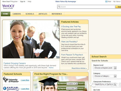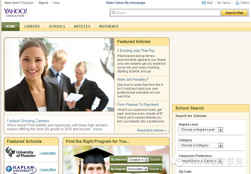 雅虎教育是针对大学生群体的一个资讯类网站,主要内容是关于一些学校和职位的信息以及课程信息等。建立该网站的初衷是将用户与教育提供者及内容提供商建立连接。