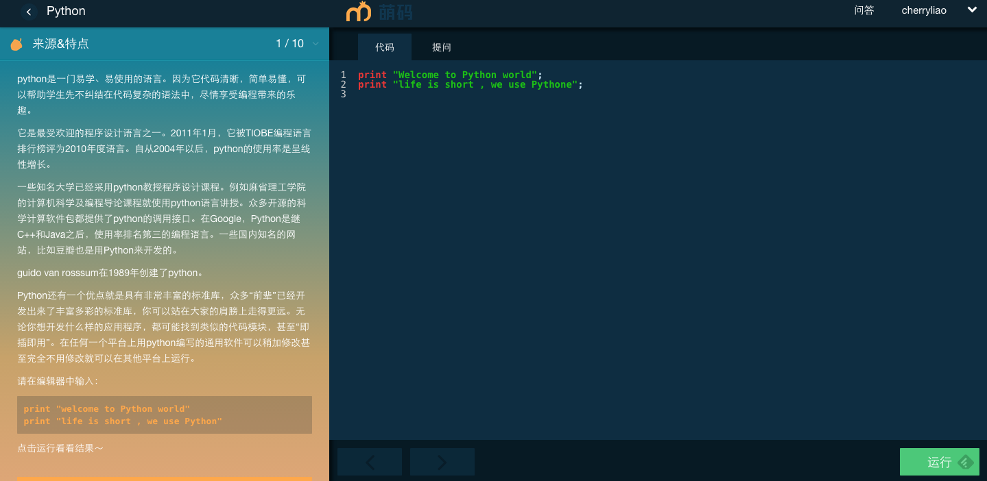 “萌码”的设计与国外趣味类零基础编程教学网站十分相似,左侧为知识讲解和小练习,右侧为在线编译器。学习者学会知识点,并利用相关知识点在右边的编译器中编码并运行成功后,才可以进行下一课的学习。