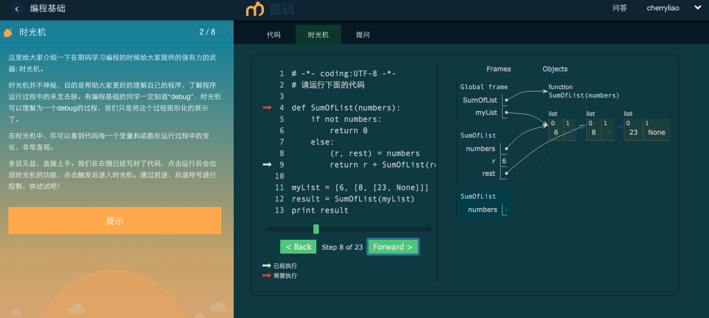 此次“萌码”上线的创新点在于“时光机”功能,该功能可以让用户随时回放之前的编程步骤,并以图形的方式一步一步进行显示,让用户在学习的过程中及时发现自己的错误并改正。