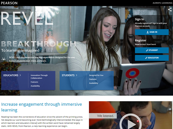 有了REVEL,教育工作者可跟踪了解学生在每次阅读作业上花的时间和他们评分表现,REVEL可以在上课前提供有关学生学习和理解的全面情况。REVEL也提供完整的移动体验,使学生能在设备上随时随地阅读课程材料和与课程材料互动。开发REVEL综合了超过2.3万教育工作者和学生的反馈信息。