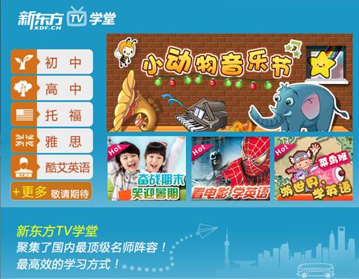 在今年5月22日,百视通与新东在线联合宣布,双方将在都看好的电视数字教育市场展开战略合作。双方将基于百视通IPTV业务推出“新东方TV学堂”,由新东方老师主讲的中学全科教学内容将可以直接点播,之后也会推出托福、雅思、日常英语等内容。