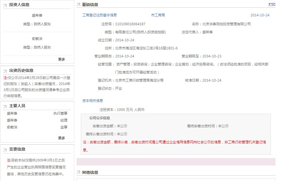 信息显示,“北京洪泰同创投资有限公司”成立于10月24日,法定代表人为盛希泰。盛希泰任执行董事,俞敏洪任监事。