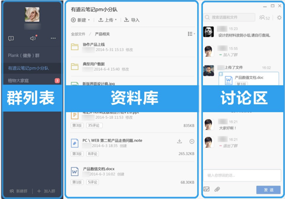目前有道云笔记用户可以直接通过有道云笔记进入有道云协作,目前其界面被分为三个部分,中间是文件资料,左边是群列表,右边是讨论区。