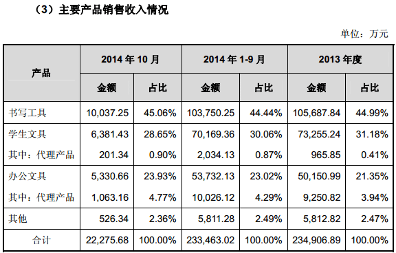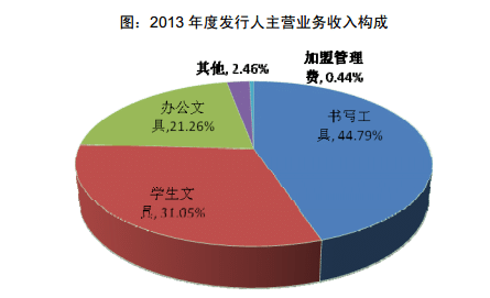 2013 年度公司主营业务收入23.59亿元, 其构成比例分别为:书写工具44.79%、学生文具31.05%、办公文具21.26%、其他2.46%及加盟管理费0.44%。2014年1-9 月公司主营业务收入23.43亿元, 其构成比例分别为:书写工44.27%%、学生文具 29.67%、办公文具22.93%、其他2.75%及加盟管理费0.38%。在主营业务构成中,其他主要包括计算器、耳机等学生电子产品,加盟管理费为公司向晨光文具加盟店的被特许方收取的管理费。
