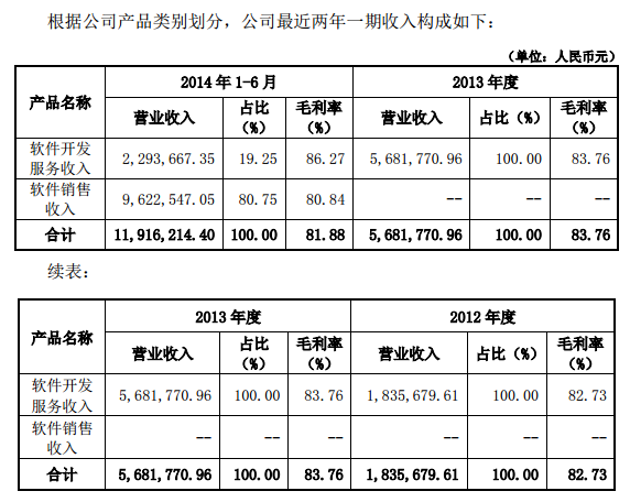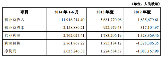 公告披露,2014年1-6 月、2013 年、2012 年,公司经审计的营业收入分别为1191万元、568万元、183万元;净利润分别为203万元、122万元、-108万元。