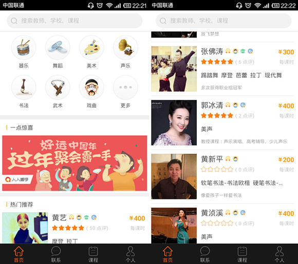 多知网对此产品进行试用发现,“人人趣学”分为器乐、声乐、舞蹈、美术、书法、戏曲、球类、武术、健身、美食等大类,主打艺术和体育培训。据官方称,人人趣学初期主打明星授课。平台上也有业界知名的老师授课。