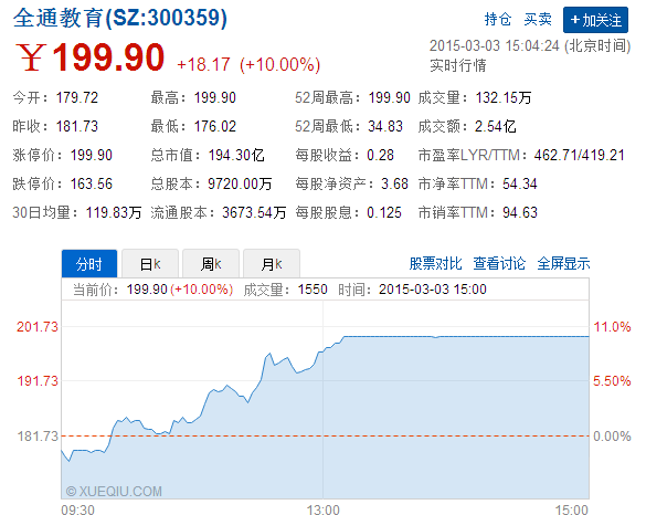 多知网3月3日消息,今天开盘后全通教育涨停,截至发稿时,股价为199.90元,市值193亿人民币,超越新东方30.94亿美元(折合人民币190亿元)的市值。