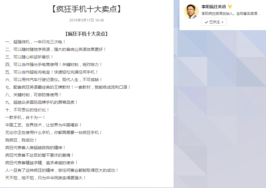 今天早上,李阳在自己微博中发表了《“疯狂手机”十大卖点》文章,以下为文章全文:
