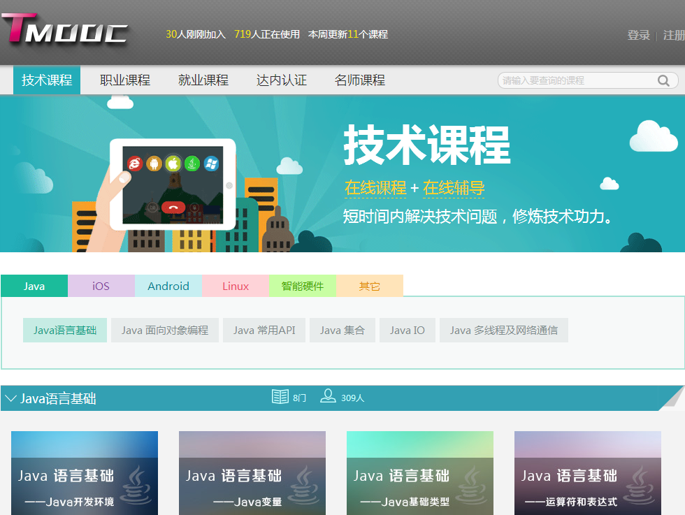TMOOC平台上的课程分为职业课程和技术课程。职业课程相当于一个领域的某些阶段,比如数据库、Web前端等。一名Java程序员,可能在某些阶段存短板,可以选择我们的某一门职业课程。