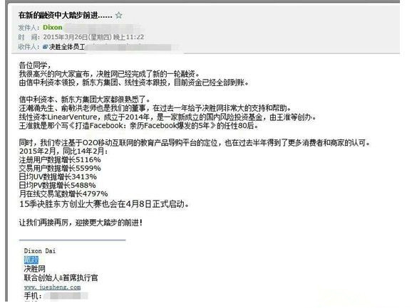 同时,戴政在邮件中提到了一些运营数据:相比2014年2月,2015年2月决胜网注册用户数据增长5116%,交易用户数据增长5599%,日均UV数据增长3413%,日均PV数据增长5488%,月在线交易笔数增长4797%。