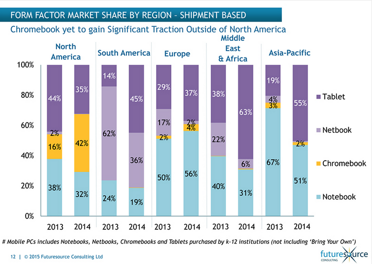 Google在教育市场上的努力,让Chromebook在全球市场的份额不断扩大。根据FUTURESOURCE CONSULTING的报告显示,Chromebooks已经在北美的K-12市场占领了42%的份额,而这个数字在2013年,只有16%。而即使在其他国家和地区,Chromebook的市场份额也是十分不错的。